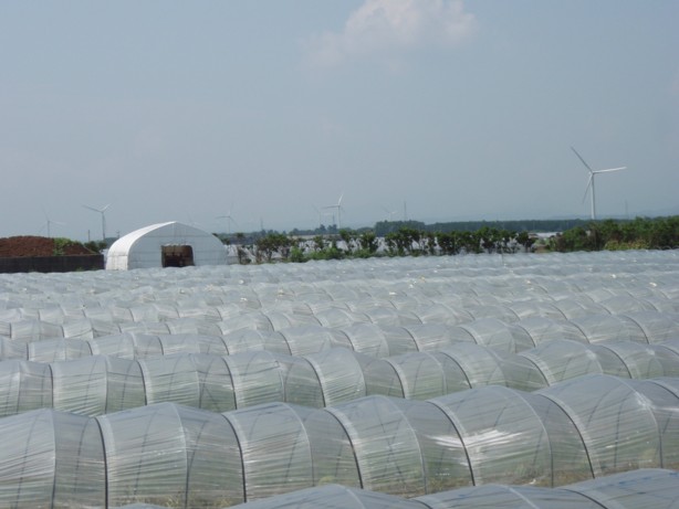 マラソン大会レース中に撮ったビニールハウスすいか畑と風車群です。