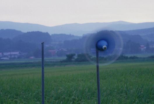 田んぼに風車のようなものが立ってました。