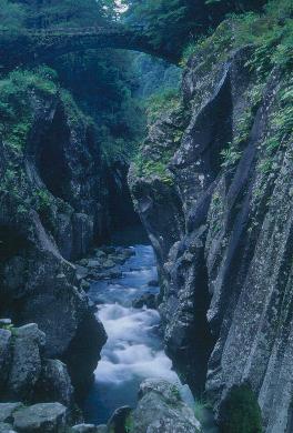 ごつごつ黒々とした峡谷を流れる水は