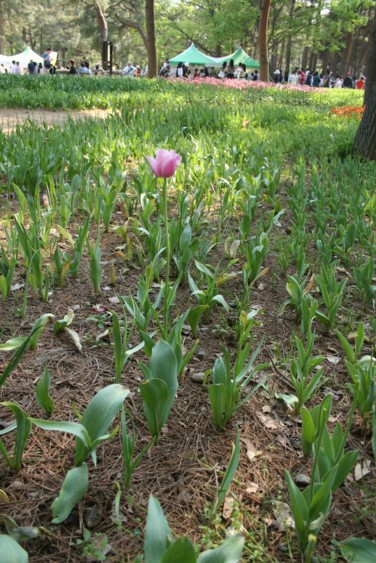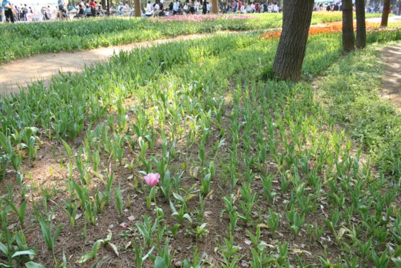 賑やかな人波をさけるかのようにチューリップが一輪咲き。