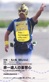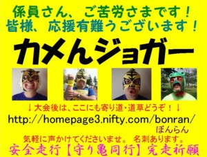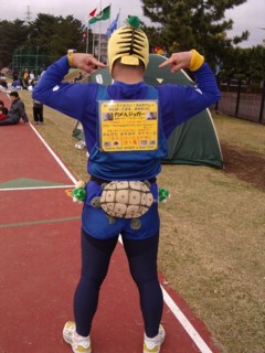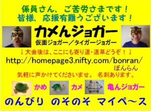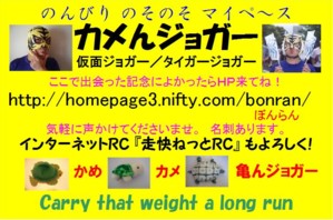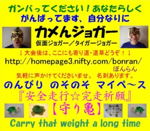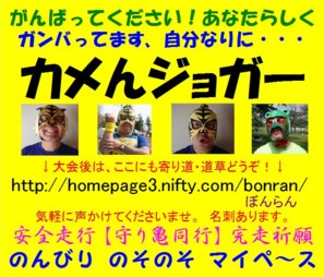 看板をリニューアルしました。バージョンVです。 胸用と背中用をそれぞれ文面やレイアウトを変えてみました。 胸用最上部には係員さんと応援の皆さんに向けてのメッセージを入れました。 又、前看板では最上部にあった「のんびり のそのそ マイペ〜ス」文を最下部に持ってきました。 背中用最上部にはランナーに向けてと、自分に対しての応援文を入れました。 『安全走行☆完走祈願』の【守り亀】を装備していますと新たな注釈文も入れました。 前看板では、「〜 long run」 としていた英文を 「〜 long time」 と原文のままに変えました。 2006年4月作成 | |