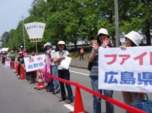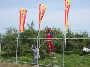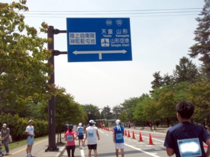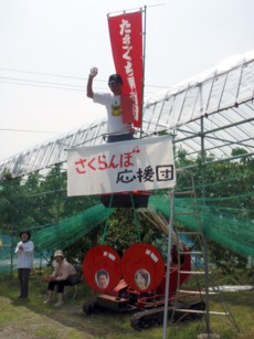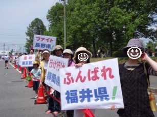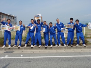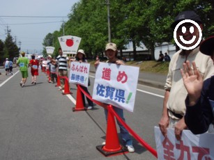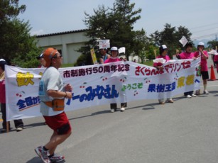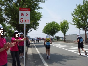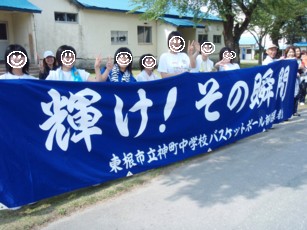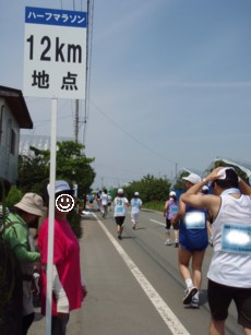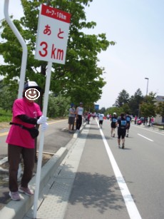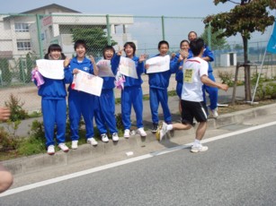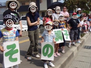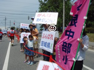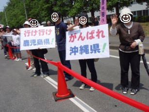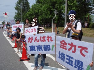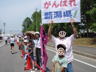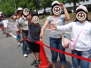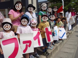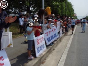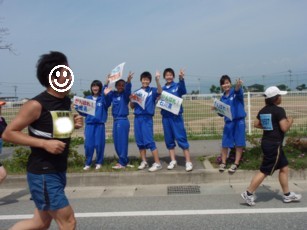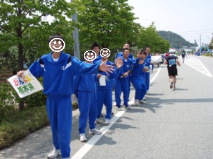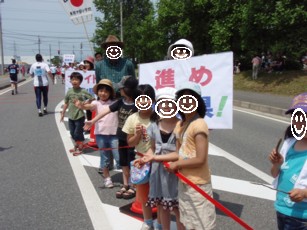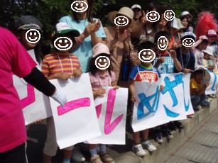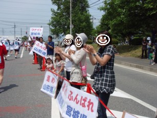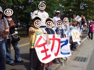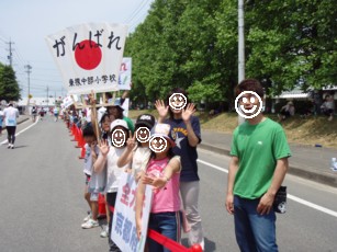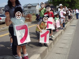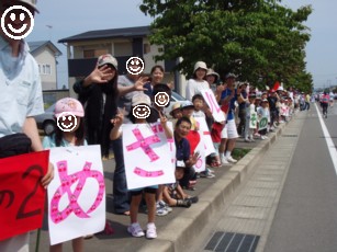 ↑神町小学校生徒と保護者がお手製ボードと共に応援してくれます↓